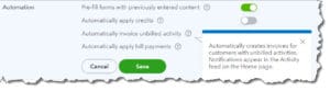 • Automation. QuickBooks Online can take some actions automatically, but consider carefully whether you want it to do so. For example, should unbilled activity be automatically invoiced? Should credits be applied automatically?