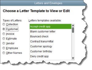 QuickBooks integrates well with Microsoft Word, producing business letters from templates in the software. You can, of course, compose your own, but there are numerous pre-written letters that may serve you well. You can copy and paste the finished product into an email, but it’s nice to get a printed letter in the U.S. Mail sometimes. It’s less likely to be quickly deleted. Plus, it looks more official, which some of these letters should definitely be.