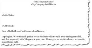 Click the button in front of Customer in the first column, then highlight Customer apology in the second. Then click Next. Word opens and displays that letter template. Every element of the letter that will be replaced with your own QuickBooks data contains a merge field surrounded by arrows, a kind of placeholder that shows you which fields will be replaced, and with what.